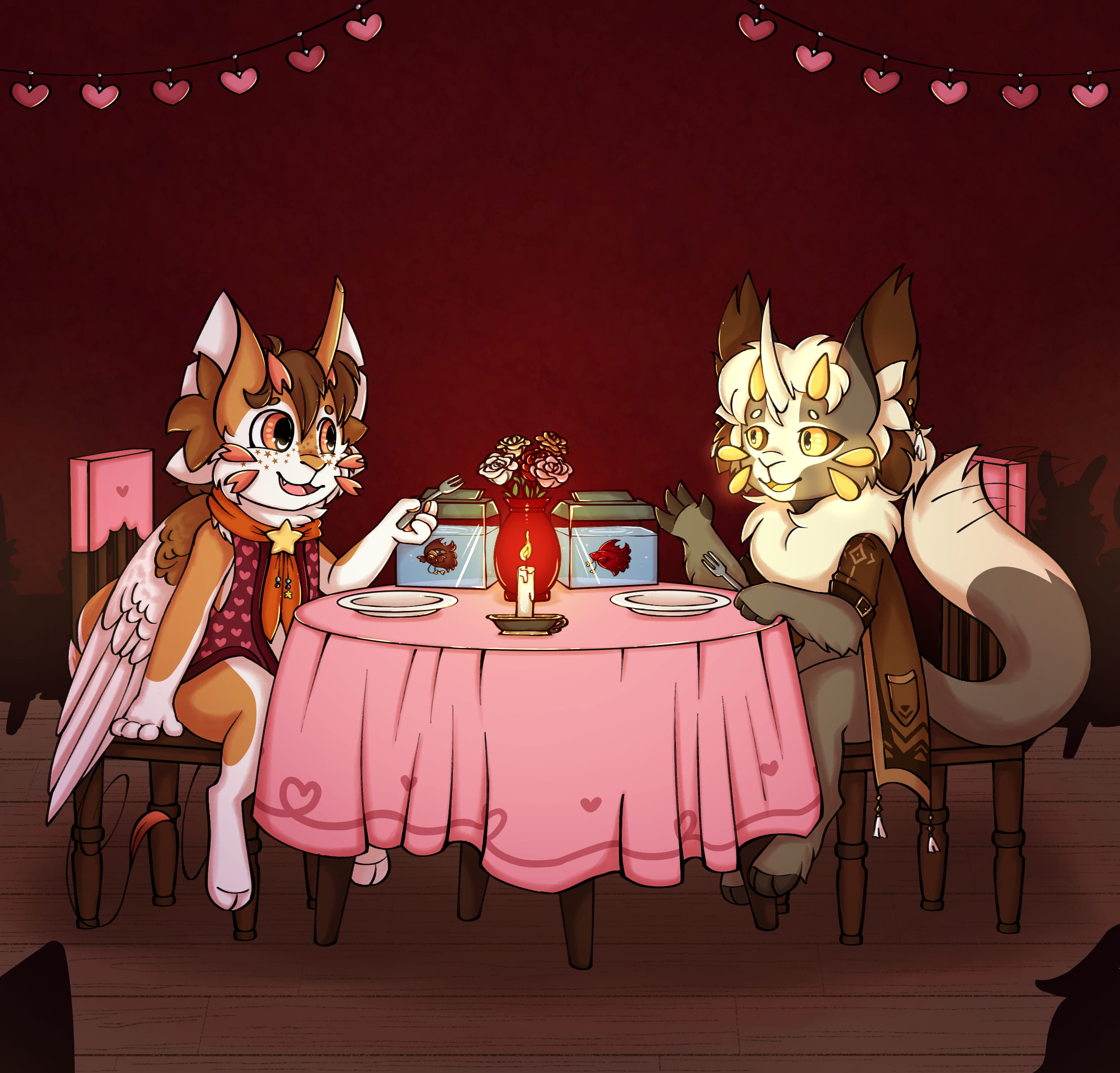 An elegant Nyulop stood at the other end of the table, tan and white, with golden eyes and whiskers. A set of earrings swayed gently from ears that mirrored Jonathan’s own. In his claws sat a little travel tank with a heart betta swimming inside.