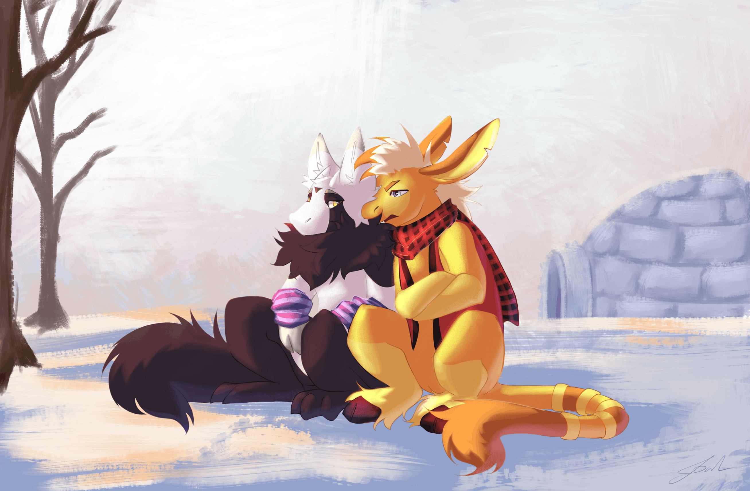 After a snowball fight, Leon got cold, and Alba's fur seemed perfect for him to warm himself up!