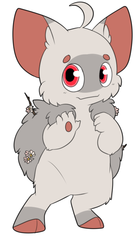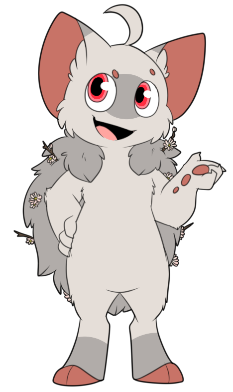 Remember to include your chosen plant in the correct areas! For Nyulop, the flowers appear to be growing from their tails! You may add several (1-7) visible branches/flowers/buds to your Nyulop's tail. They must match the appearance and palette of your respective plant. They should not be excessively long and appear similar to the example shown above.