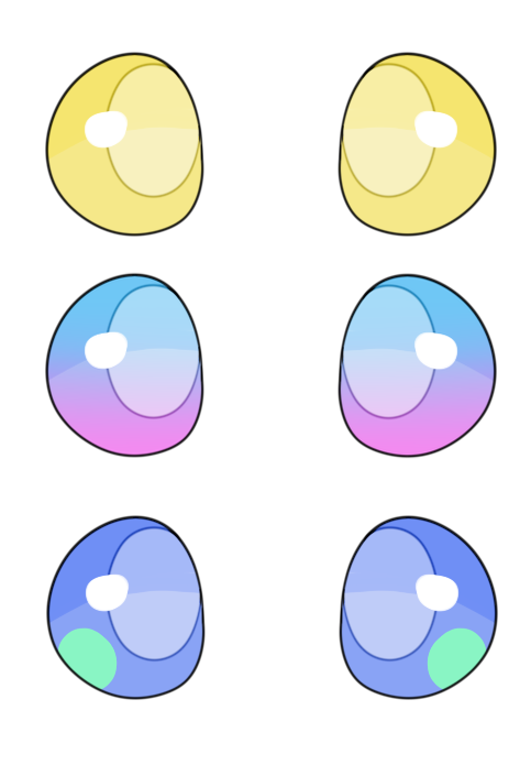Space Debris’ eyes are a solid color, with a pupil that is a lighter version of the iris color that is not pure white (#ffffff.) This pupil should be light enough it is visually distinct from the iris.